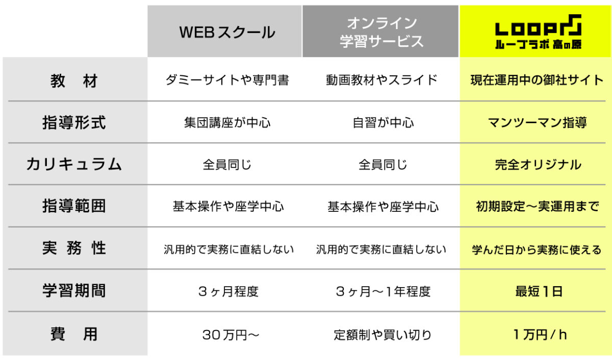 一方、LOOPラボ高の原は御社サイトをそのまま教材に使用し、オリジナルのカリキュラムを組むため、習得したスキルを即業務に直結させることができます。
