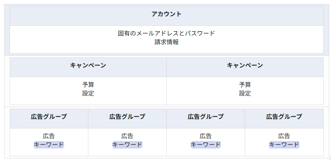 Google検索広告は、「アカウント → キャンペーン → 広告グループ → 広告」という4つの階層で構成されています。