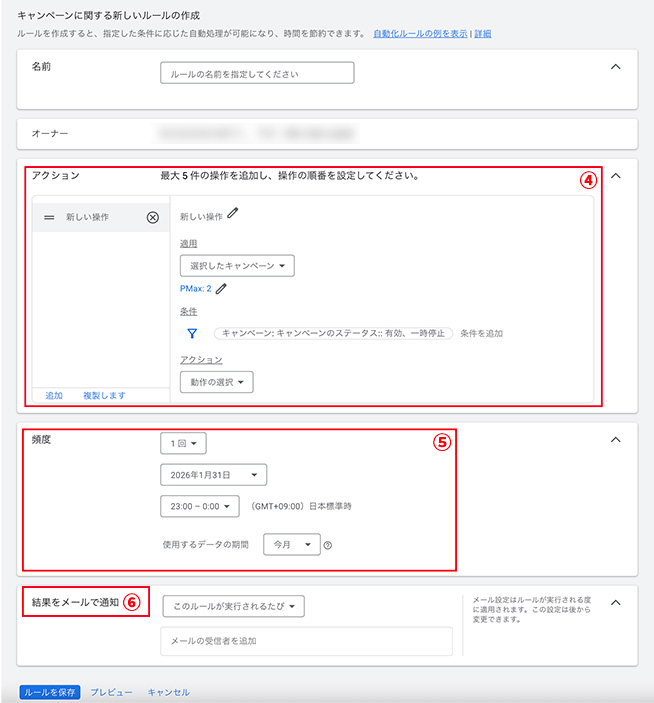 ⑥「結果をメールで通知」を設定。(変更やエラーを把握できるためおすすめ。)