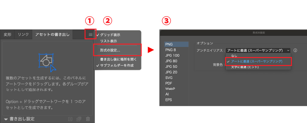 ①「アセットの書き出し」パネル右上の三本線をクリック