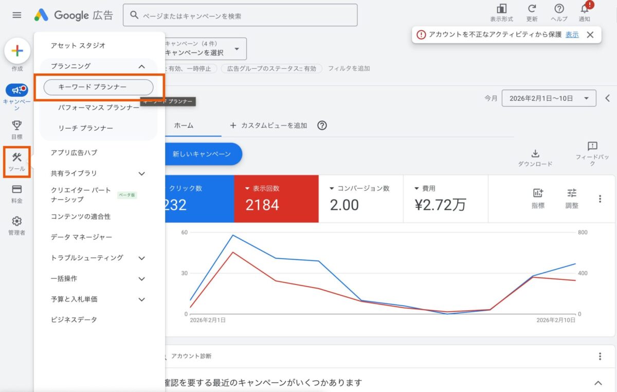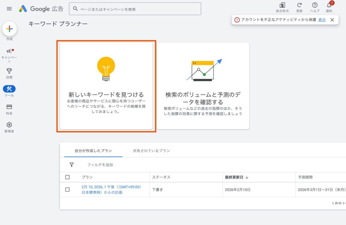 キーワードプランナーはGoogle広告アカウント内のツールです。