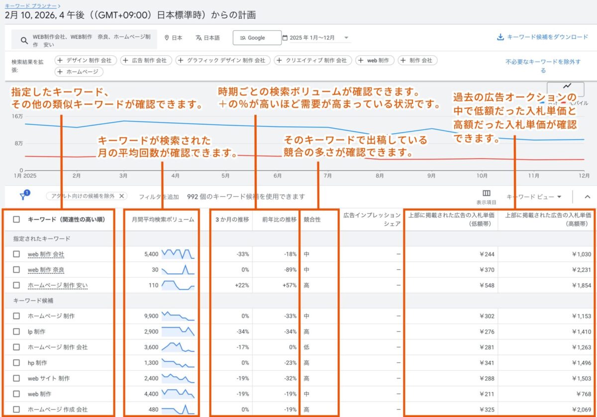 「検索ボリューム」「競合性」「ページ上部に掲載された広告の入札単価(低額帯)」「ページ上部に掲載された広告の入札単価(高額帯)」などが表として現れるので確認し、広告設計のヒントとして利用しましょう。