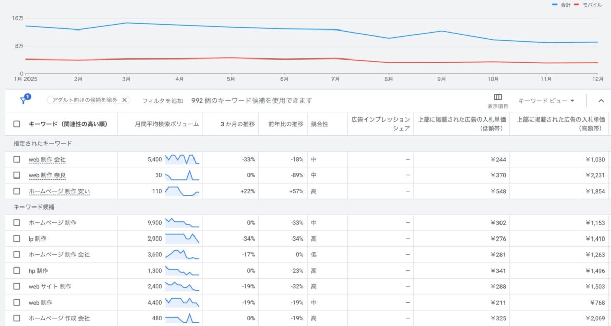 検索ボリュームや競合性、想定クリック単価などを確認でき、広告出稿だけでなくSEOやコンテンツ制作にも活用できます。