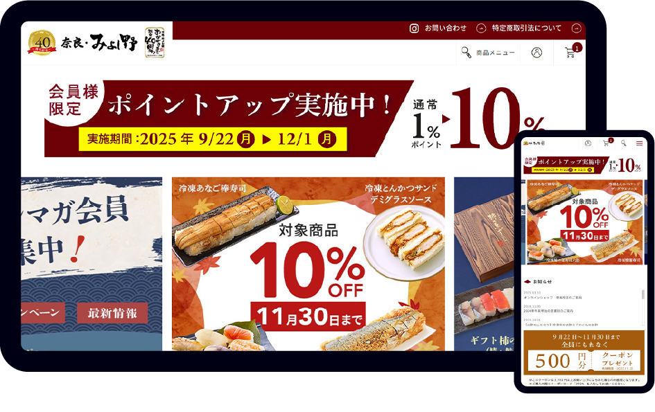 EC 奈良・みよし野様(ECサイト) VIEW SITE クライアント 奈良・みよし野様 業種 製造販売事業 URL https://www.miyoshino.co.jp/ 公開日 2022/03 提供サービス コーディングデザイン PREV NEXT